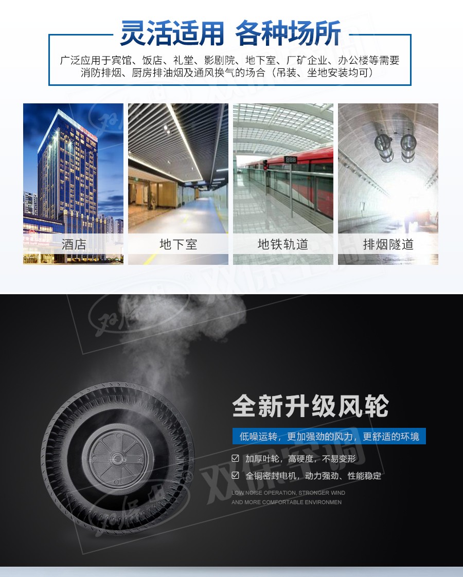 【風機特點】一機兩用、噪聲低、耐高溫性能優(yōu)良、結(jié)構(gòu)新穎緊湊、振動小、重量輕、安裝維護方便等